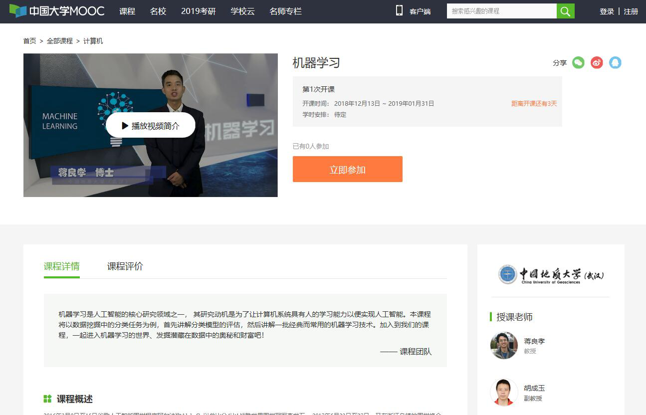 2018年12月13日,电影天堂 (武汉)《机器学习》课程在中国大学MOOC平台正式开课。本课程由电影天堂 教授蒋良孝,电影天堂 副教授胡成玉主讲,课程内容精心设计,为学生提供了便利的学习平台。本课程将以数据挖掘中的分类任务为例,首先讲解分类模型的评估,进而讲解一批经典而常用的机器学习技术,是高等学校机器学习领域科研人员和对机器学习兴趣浓厚的师生不可或缺的高质量课程。课程链接: