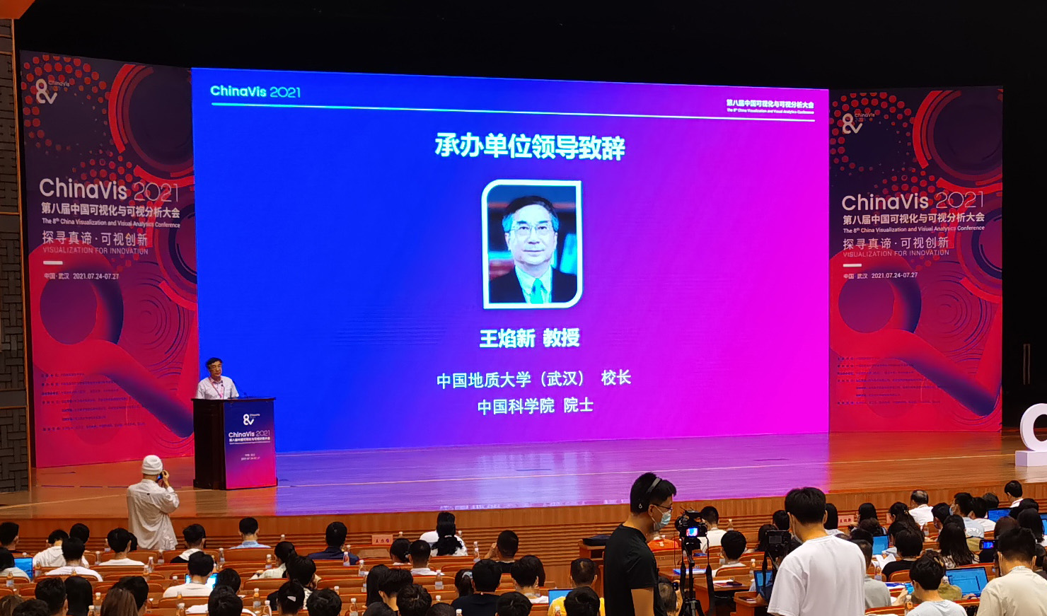 (武汉)校长、中国科学院院士王焰新教授致辞,在对各位专家和来宾表示热烈欢迎的同时指出,大数据时代离不开可视化技术,更呼唤可视化与可视分析研究与应用的创新。他提到武汉是一座英雄的城市,更是一座创新的城市,是国内外知名的空间信息技术重镇,在地理空间信息可视化技术和产业化方面具有很好基础。此次会议,以“探寻真谛、可视创新”为主题,搭建了与国内外著名专家、企业家、应用部门面对面交流,深入研讨可视化前沿技术及其应用的交流平台,推进学科的发展,促进人才培养和交流。大会的举行将促进中国可视化与可视分析领域产、学、研、用协同发展新生态的形成,砥砺创新思想、激发创新火花,不断提升国际影响力、思想创造力、战略支撑力,广泛服务于国家战略和社会发展。