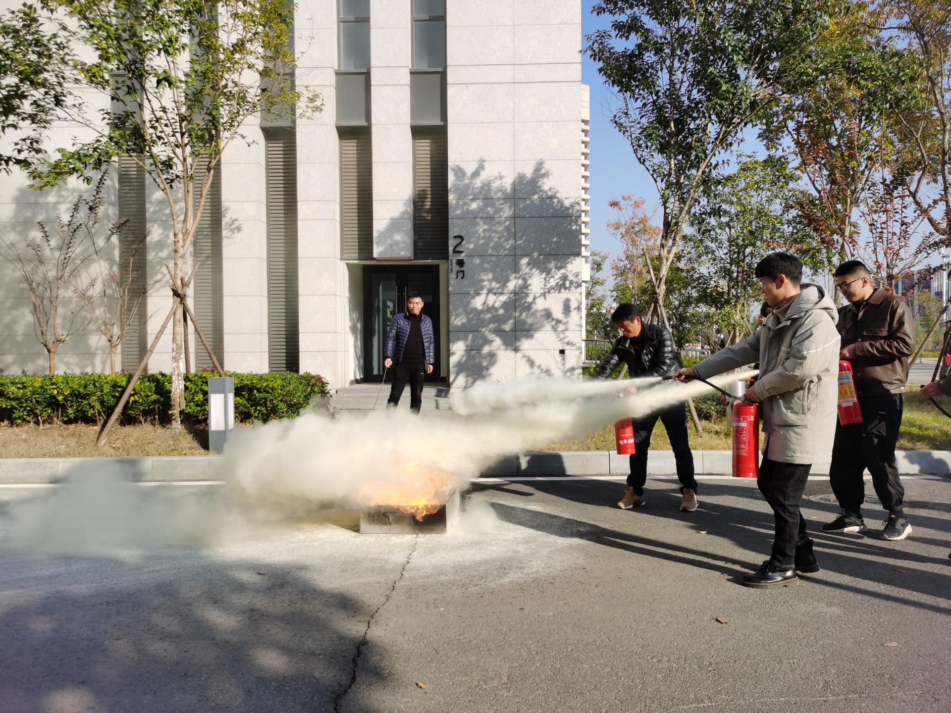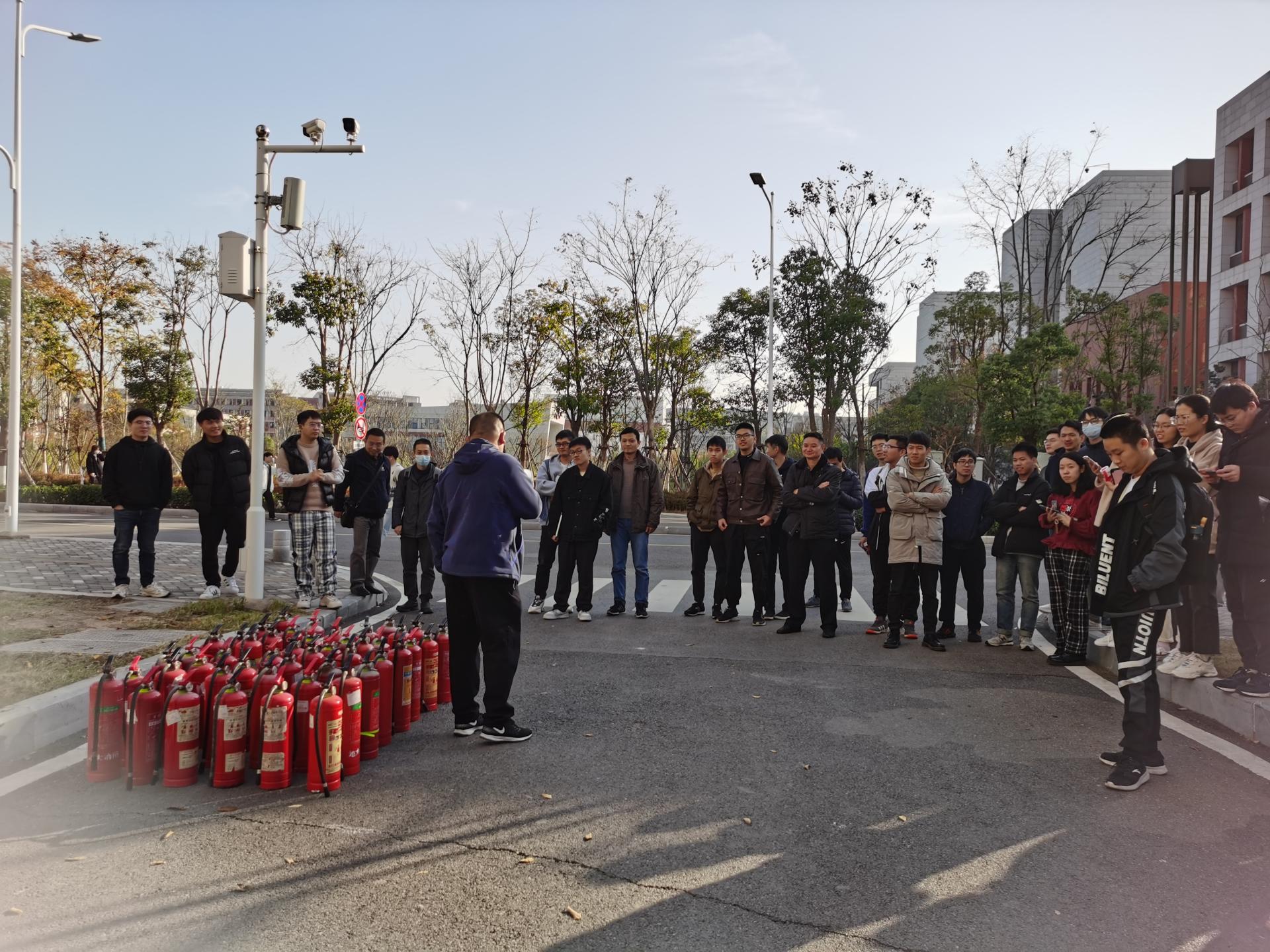 随后,周科长带领师生前往户外,组织大家进行消防演练活动,以实操来熟悉灭火器的使用方法。