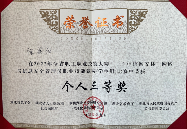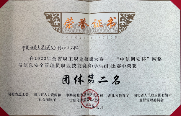 近日,从2022年湖北省第一届“数字工匠”技能大赛暨“中信网安杯”网络与信息安全管理员职业技能竞赛组委会获悉,由电影天堂 信息安全系朱静老师指导的“Flag又不队”战队(队员:覃程伟、孙升阳、张涛)以总分第二名的成绩荣获团体攻防对抗赛学生组二等奖,由马钊老师指导的“Flag对不队”成员徐盛华以总分第六名的成绩斩获个人综合靶场赛学生组三等奖。