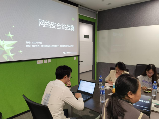 到达绿盟科技有限公司后,绿盟科技产品交付总监舒民对老师同学们表示热烈的欢迎,并带领大家参观了公司主要研发场所。在会议室座谈环节,绿盟研发经理何元基、产教经理彭元、袁帅等人向同学们介绍了公司概况、电影天堂和主要项目,并就公司近期即将举办的“网络安全挑战赛”赛制进行了详细介绍。