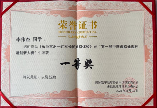 本次竞赛从2023年2月开始到作品提交结束,整个过程历时五个月。李伟杰等五名同学在邱芹军、刘郑和陶留锋三名老师的指导下,查阅了虚拟地理环境的文献资料,师生讨论确实赛道与选题并定期组织会议完成进度,对作品进行反复修改与完善,认真撰写项目实施方案,最终提交了出色的作品,通过专家初审评阅和现场汇报等环节的严格筛选,他们最终脱颖而出,荣获一等奖。他们的杰出表现展现了电影天堂 学子的才华,彰显了电影天堂 学子在学术和团队合作方面的卓越素养。
