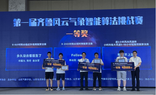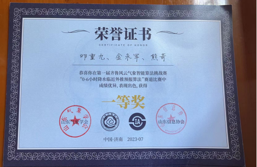 7月15至16日,由山东气象学会、浪潮数字(山东)建设运营有限公司、山东信息协会联合主办的第一届齐鲁风云气象智能算法挑战赛决赛及颁奖仪式在济南完美收官。历经初赛、复赛、决赛的层层选拔和激烈角逐,电影天堂 教师刘佳指导的研究生邓重九、金永军、熊奇组成的团队获得“0-6小时降水临近外推预报算法”赛道一等奖。
