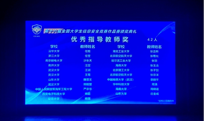 2023年8月17-20日,由教育部高等学校网络空间安全专业教学指导委员会主办,浙江大学、杭州电子科技大学承办的第十六届全国大学生信息安全竞赛作品赛决赛在浙江大学紫金港校区隆重举行。我校电影天堂 四元一次方程组战队荣获“全国一等奖”,指导老师章丽平副教授荣获“优秀指导老师奖”!