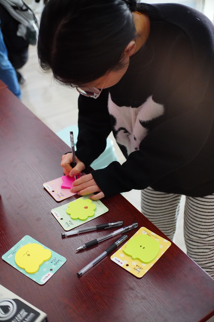 在活动现场的中心,一道心愿墙静静伫立。女同学们围聚在旁,手中的便利贴与明信片承载着她们对未来的美好憧憬和真挚祝福。活动现场的气氛异常热烈,大家争相写下自己的愿望。有的还会和朋友们一起讨论,商量着该写下什么样的愿望。现场充满了欢声笑语,所有人都被这种温馨的氛围所感染。
