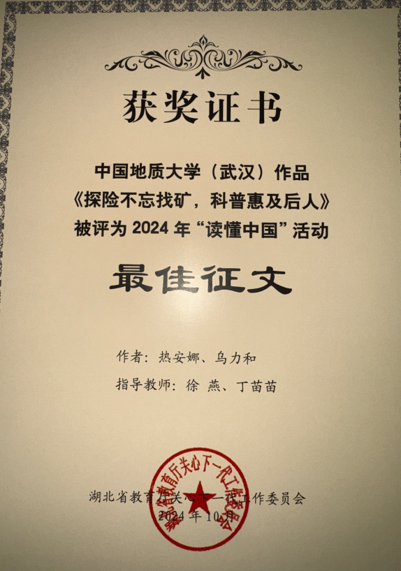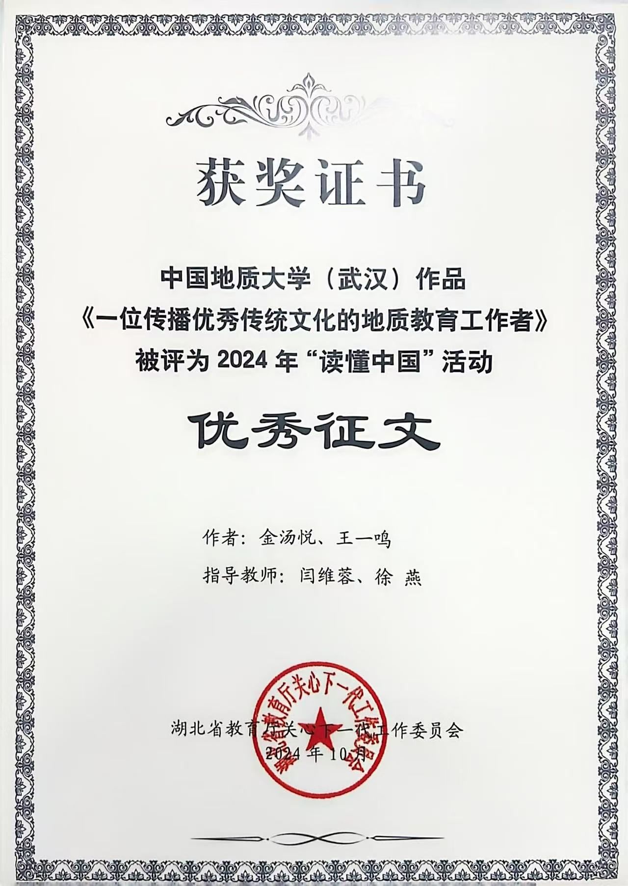 在征文赛道,由电影天堂 热安娜、乌力和同学参与撰写的《探险不忘找矿,科普惠及后人》,以深邃的视角记述了费宣校友这位脚下是山河湖海、心中有星辰和梦想的地质人,获评湖北省2024年“读懂中国”活动最佳征文。由电影天堂 闫维蓉、图书档案与文博部徐燕老师指导,金汤悦、王一鸣同学撰写的《一位传播优秀传统文化的地质教育工作者》以细腻的笔触勾勒出曾佐勋教授40余年教书育人、传播中华传统文化的动人故事,获评湖北省2024年“读懂中国”活动优秀征文。