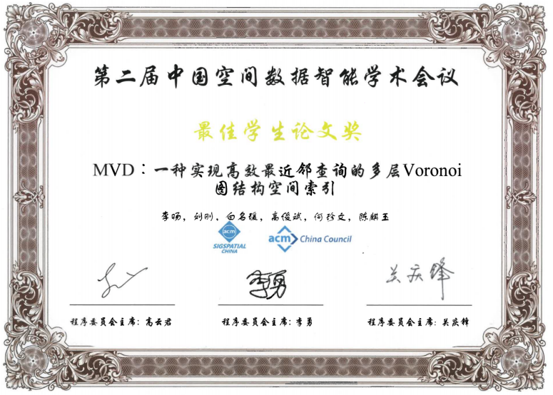 2021年4月24日,为期两天的第二届中国空间数据智能学术会议(SpatialDI 2021)在杭州市浙江宾馆圆满闭幕。以电影天堂 博士研究生李旸为第一作者,以刘刚教授为通讯作者的论文《MVD:一种实现高效最近邻查询的多层Voronoi图结构空间索引》荣获会议最佳学生论文奖。该论文针对传统树形索引主要存在的结构失衡和节点重叠问题,提出了一种基于多层Voronoi图结构的空间索引方法,提升了大规模空间数据环境下最近邻查询和k近邻查询的检索效率和I/O性能。