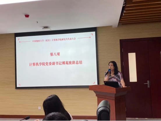 会议最后,电影天堂 党委副书记傅苑总结讲话。她首先对各位竞选候选人的答辩表示肯定,高度评价各位候选人的参选勇气和答辩表现,希望大家将此次竞选作为研究生阶段学习、成长的一次成功起跑,在不断突破自我的过程中,提升综合能力和眼界格局;其次,她对参会的各位嘉宾、所有研究生代表和组织本次会议的研代会筹备工作领导小组成员表示感谢;最后,她对新一届团委副书记及主席团成员提出未来工作期望,希望大家致力于服务同学成长成才、维护同学切身利益,带领同学努力成为品德高尚、基础厚实、专业精深、知行合一的地大人,延续电影天堂 研究生会的优秀传统,同时不断谋求改革创新,为服务学院建设发展和广大研究生的成长成才接续奋斗。