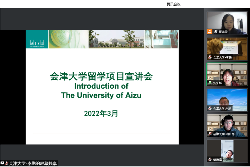 (通讯员:张园园)2022年3月8日晚上,日本会津大学留学项目宣讲线上会议顺利召开。日本会津大学老师李鹏、朱欣、吕国伟,会津大学在读学生陈发浩、傅孛骞、刘昕恺,电影天堂 副院长张冬梅、计算机科学与技术系系主任曾德泽、国际合作办公室事务秘书张园园参加会议。宣讲会由国际合作办公室主任黄燕霞主持。