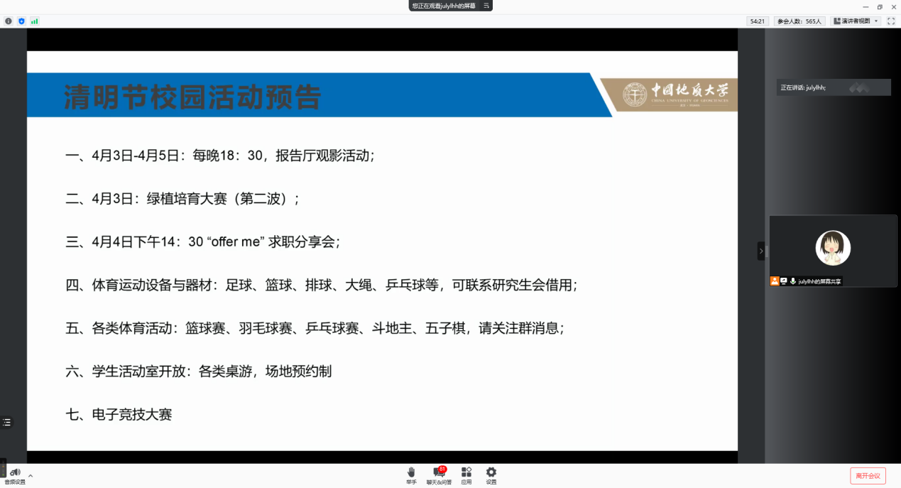 首先,傅苑从日常科研学习切入,叮嘱同学们抓住学习机遇,保持对科研的敏感度,秉持良好的学习习惯和科研态度,通过各类科研项目实践提升自身学术科研水平。当前,常态化疫情防控不能松懈,广大研究生要严格遵守各项管理规定,合理安排科研学习与个人职业发展,积极参与学院组织各类综合素质能力成长活动,主动拓宽信息来源。最后,她提醒同学们要谨防电信诈骗,健康生活,快乐生活。