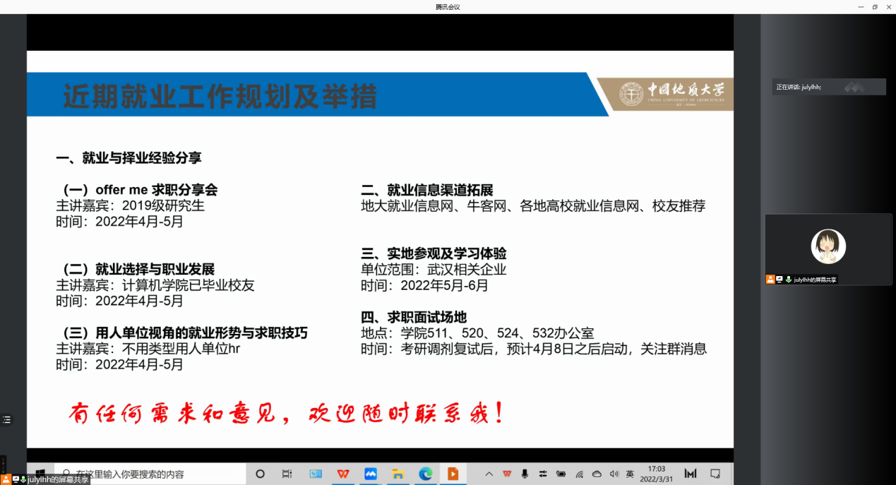 (通讯员:易章翱、马瑞华)为做好疫情防控教育引导和日常安全教育管理,促进研究生成长发展,电影天堂 研究生大会于3月31日成功召开。学院党委副书记傅苑、研究生秘书梁媛、研究生辅导员李欢欢和全体研究生参会,李欢欢担任主持。