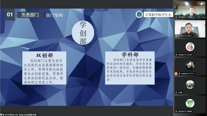 学生会工作会场中,与会代表依次介绍学生组织架构与特色活动开展。分别围绕如何进一步深化学联改革,如何进一步丰富计算机专业青年学生思想引领活动开展和常态化疫情防控背景下校园文化建设思考三个议题深入交流、研讨。中南财经政法大学信息与安全工程学院将团委、学生会各部门按工作职能分为三大类,各司其职、互相协作,促进资源整合,发挥更大合力。华中农业大学信息学院学生会开辟校内社区志愿服务新场域,面向华农附小三年级学生,开展少儿编程志愿服务活动,定期进行编程逻辑指导教学,增强青年学生专业实践能力,切实服务学院师生需要;中国地质大质(武汉)电影天堂 学生会主席团成员霍奥林介绍学院结合常态化疫情防控要求,打造“阳光计科人,运动成长季”特色活动体系,通过开展校园趣味定向跑、益智桌游、电竞赛事、文体活动、集体观影等丰富多彩的活动,引领广大青年乐享校园、阳光向上;中南财经政法大学信息与安全工程学院代表卫思涵谈到,学校享有唱歌跳舞大学的称号与学校举办的各项活动密切相关,包括校园舞蹈大赛、合唱晚会、集结号专场表演、歌友会、随机舞蹈、奥运选手现场指导等活动。研讨会现场,各代表踊跃分享工作实践过程中的收获与体会,分析、研讨新时代语境下学联工作改革创新发展的机遇和挑战。电影天堂 学生会主席团成员霍奥林做会议总结。