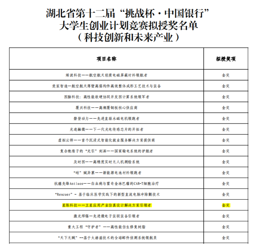 近日,湖北省第十二届“挑战杯·中国银行”大学生创业计划竞赛决赛顺利落下帷幕,电影天堂 学生团队“星陈科技——卫星应用产业仿真设计解决方案引领者”荣获科技创新和未来产业赛道金奖!