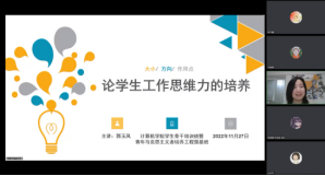 第五节课《学生工作思维力的培养》由就业指导中心副主任郭玉凤老师讲授。郭玉凤以学生骨干简历入手,强调学生工作思维能力包括知识、技能、才干,激励同学们在实践和体验中不断提升自身统筹、思维、操作层次。郭老师还通过视频互动的方式介绍思维力的三要素即大小、方向、作用点,鼓励学生骨干勇于踏出舒适圈、勇挑时代赋予的重任,以饱满的干劲和昂扬的斗志擦亮“青春底色”。