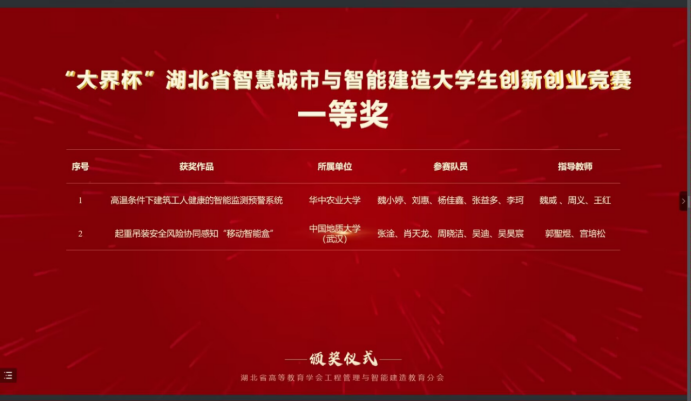 据悉全国智慧城市与智能建造大学生创新创业竞赛是当前工程管理领域影响力最大、影响范围最广的学科竞赛。本次比赛,电影天堂 2021级本科生吴昊宸与经济管理学院工程管理专业组成联队(团队成员:张淦、肖天龙、周晓洁、吴迪、吴昊宸),以参赛作品“起重吊装安全风险协同感知智能装备的研发与应用”(指导老师:郭聖煜、宫培松)进入决赛,最终从大赛主赛道来自98所高校的107支队伍的参赛作品中脱颖而出,荣获一等奖。此前在“大界杯”湖北省智慧城市与智能建造大学生创新创业竞赛中,该参赛作品已经获得一等奖。