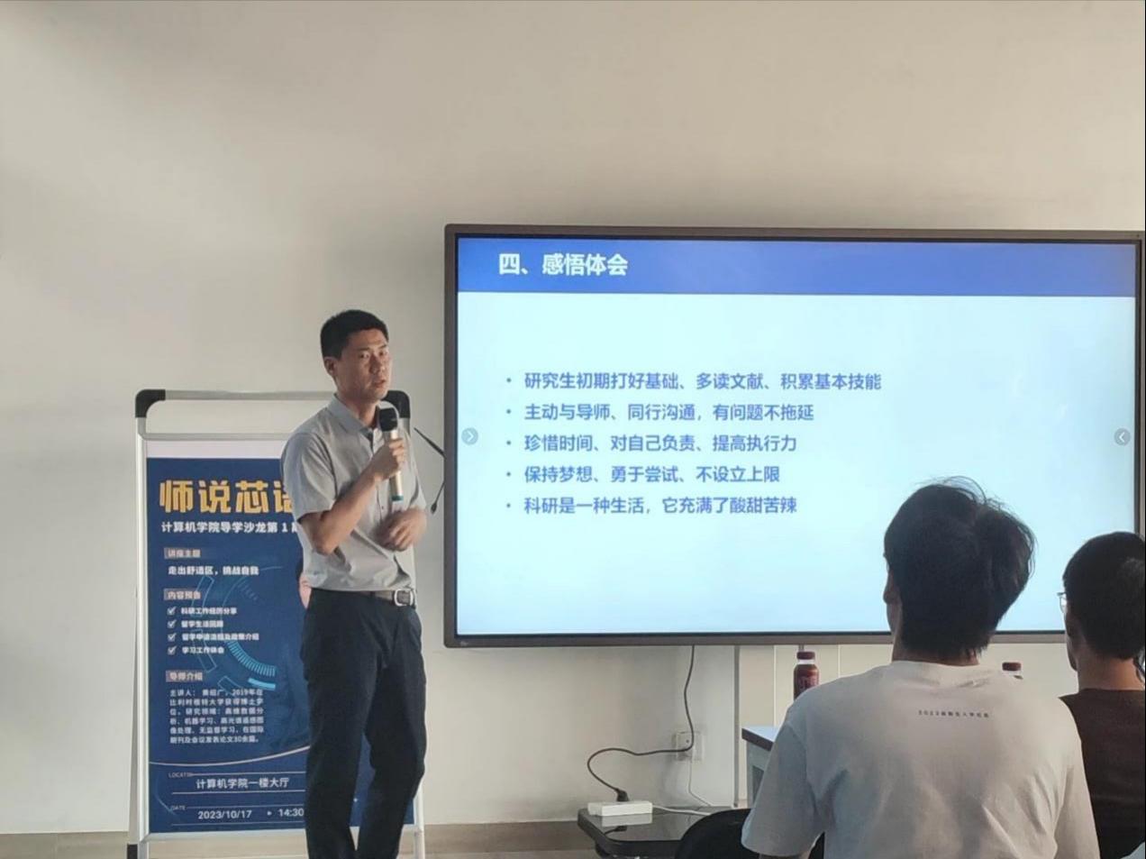 黄绍广老师从科研经历、留学生活、感悟体会三个方面向同学们介绍自己勇于走出舒适区,不断挑战自我的奋斗历程。在回顾科研经历时,他向同学们介绍了自己从本科、硕士到博士,从博士后研究员到特任教授,在自己从事的数字信号处理、机器学习等方向探索实践的过程,以自己的亲身经历鼓励同学们要树立远大理想信念,坚定目标、初心,躬身科学研究实践,以敢于求实探索的魄力去面对困难、挑战,实现人生目标。