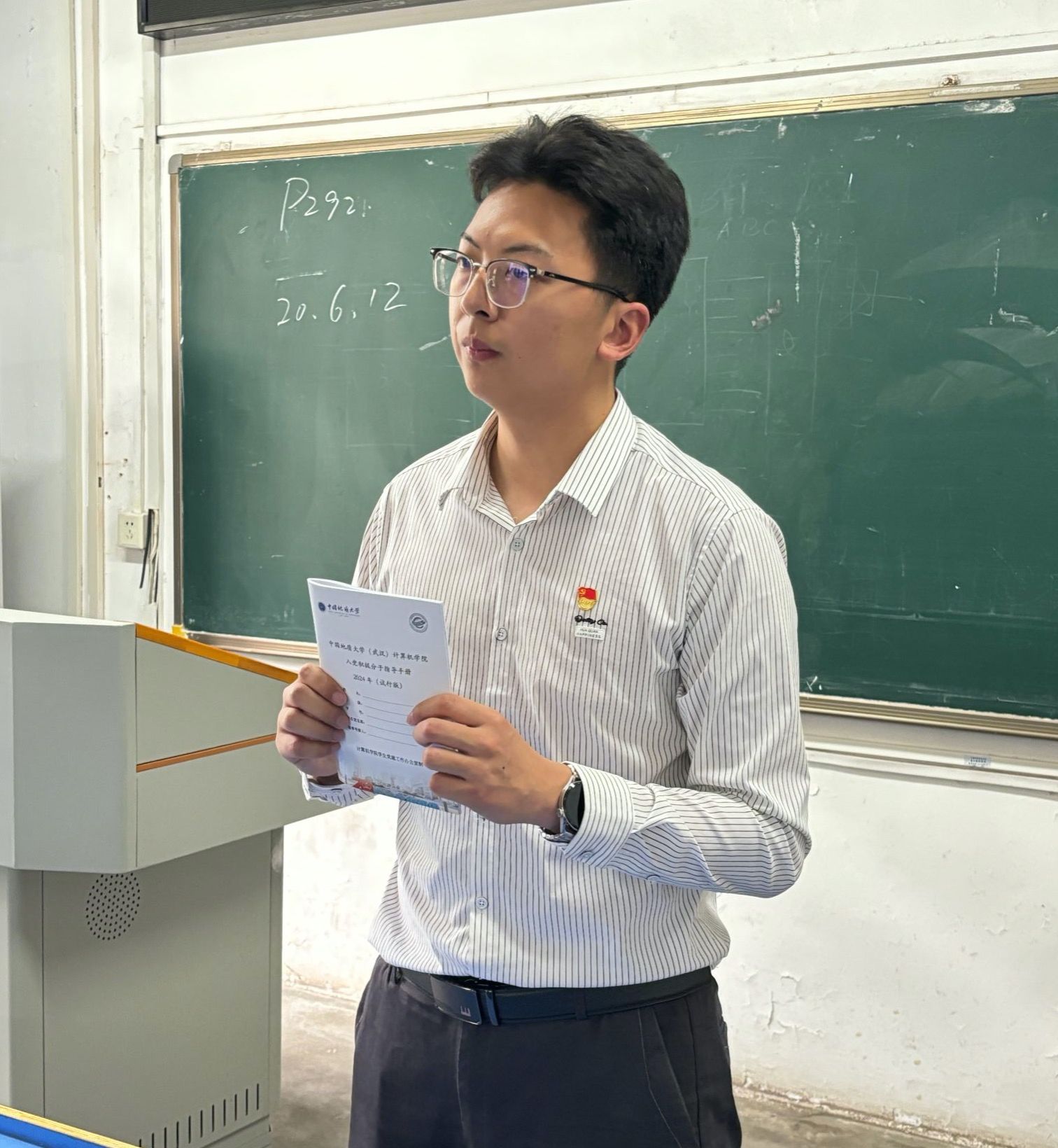 党课结束后,学院为每一位积极分子发放入党积极分子指导手册,入党积极分子可以通过阅读指导手册全面了解入党流程和材料撰写要求。在南望山校区,党建办公室主任谭文博老师与本期培训班学员交流,详细介绍了指导手册的相关内容与使用方法。培训班结束后学员有序签退离场。