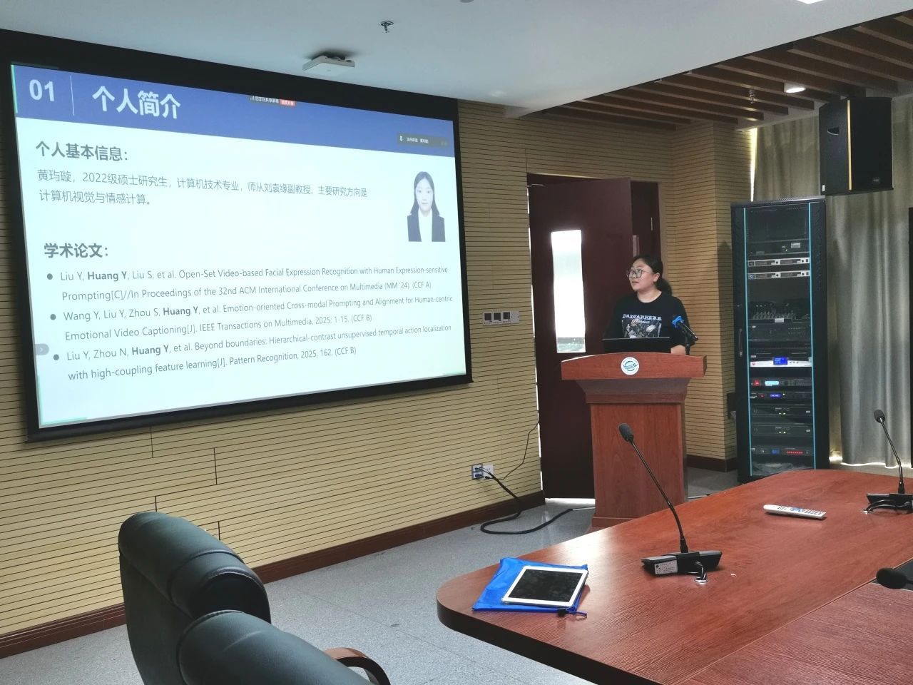 李娇分享了自己的毕设进度安排经验,涵盖从研一到研三各个阶段的任务重点,如前期积累、开题确定内容框架、写作与修改、盲审格式审查及答辩准备等。黄玙璇介绍了自身学术背景,包括研究方向、发表论文及获奖情况,并阐述其毕业论文聚焦于开放场景下人脸视频情感识别与分析,详细说明了研究内容与盲审成绩。