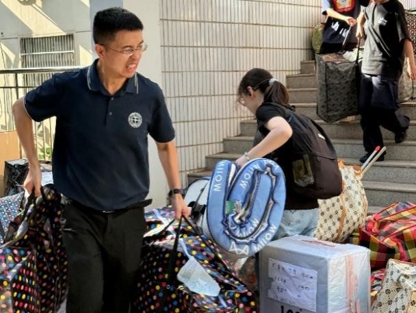 大巴驶入校园,在同学们即将入住的宿舍前,橙色的遮阳棚早已搭好,身穿蓝色马甲的志愿者们静候多时。多辆搬运车辆将学生行李送到宿舍楼下,老师和志愿者们积极帮助2024级计科学子们搬运行李,引导方向;宿管阿姨给大家发放钥匙,认真细致地登记信息;同学们团结协作,将一件件沉重的行李搬进新宿舍,开启一段全新的学习与生活旅程。