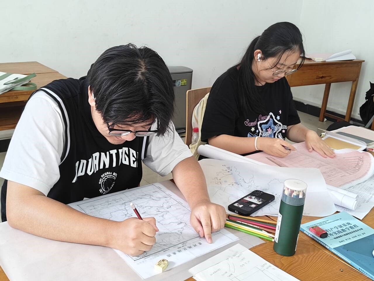9月23日,室内工作进入攻坚阶段。经过前一天的绘制,大部分小组的地质图已初具雏形,但同学们并未松懈,而是开启“精细化打磨”模式。