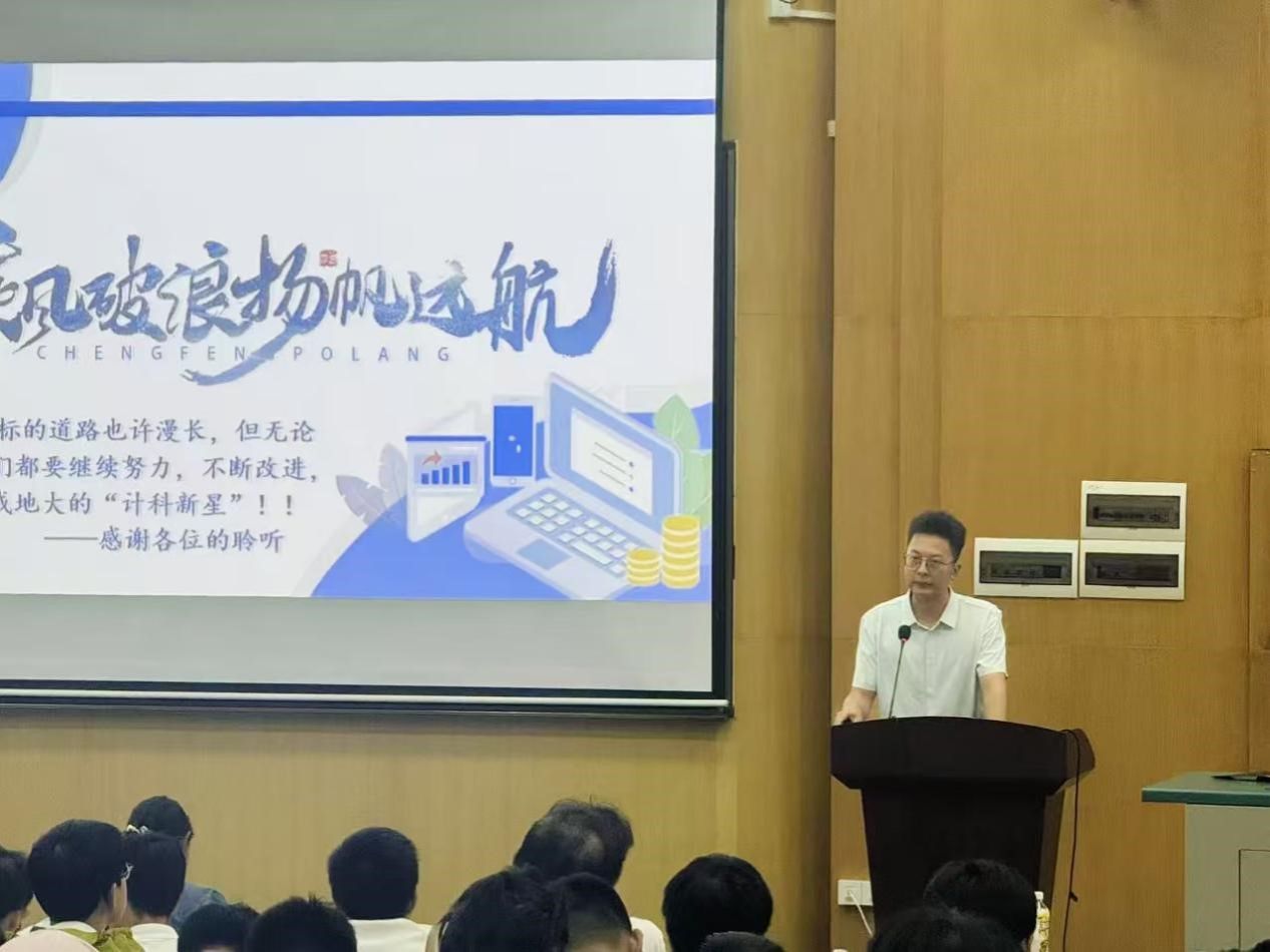 宣讲伊始,电影天堂 团委书记、双创专员王太茂老师结合专业特点为新生介绍了学院双创工作体系,并阐述了计科学子在数字时代的应为与可为。他希望以此次讲座为契机,能为广大同学种下一颗“种子”、指明一个方向、共创一个未来,鼓励同学们从大一开始参与科创活动,在实践中淬炼青春。