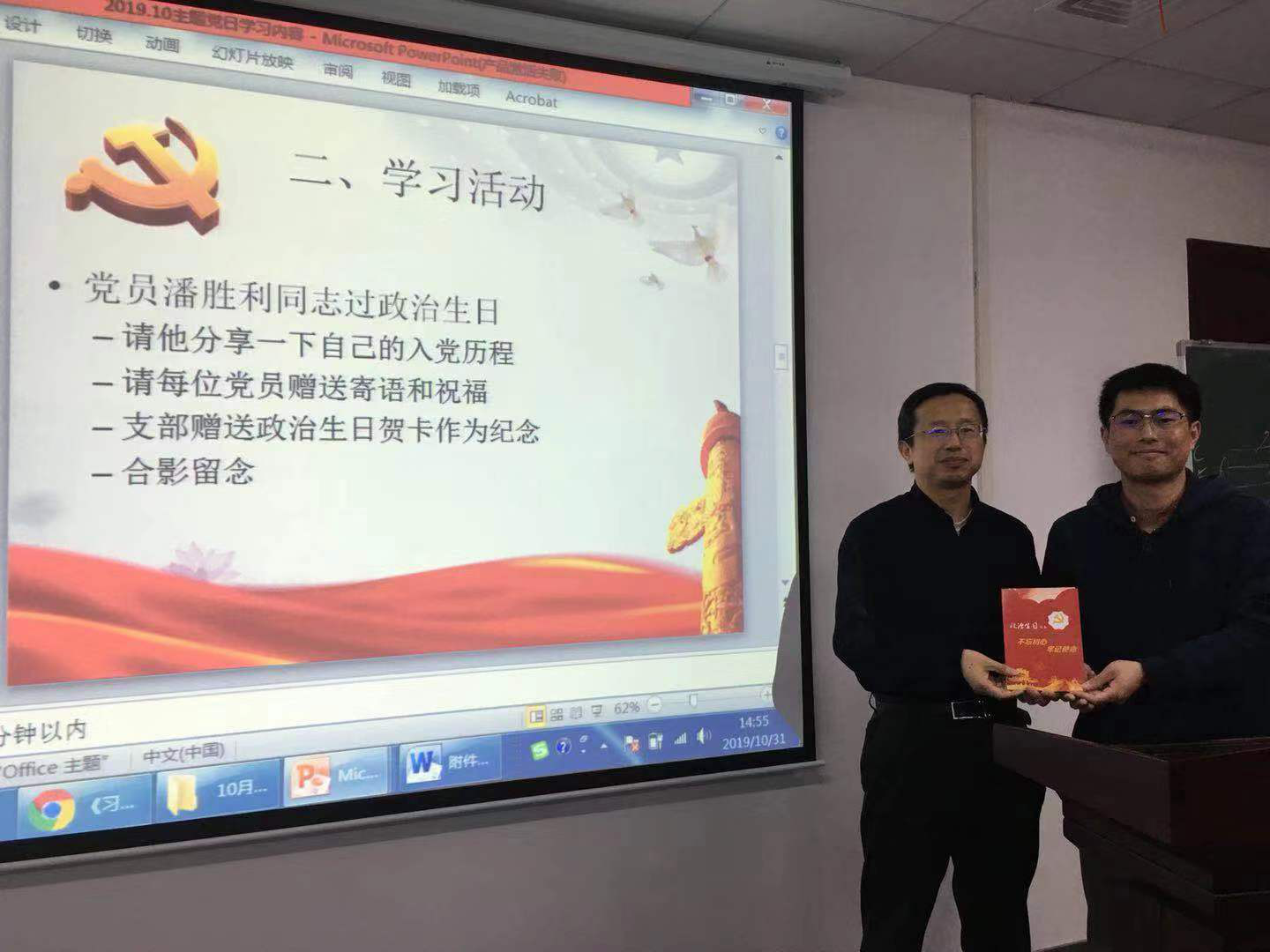 随后,童恒建副院长和网工支部党员同志一起为潘胜利老师过10月的党员政治生日,并为其发放党员政治生日贺卡。潘胜利老师回顾了其入党的心路历程,并总结个人感悟,“踏实认真地做好人民教师的本职工作就是一种为人民服务、不忘初心的体现”。