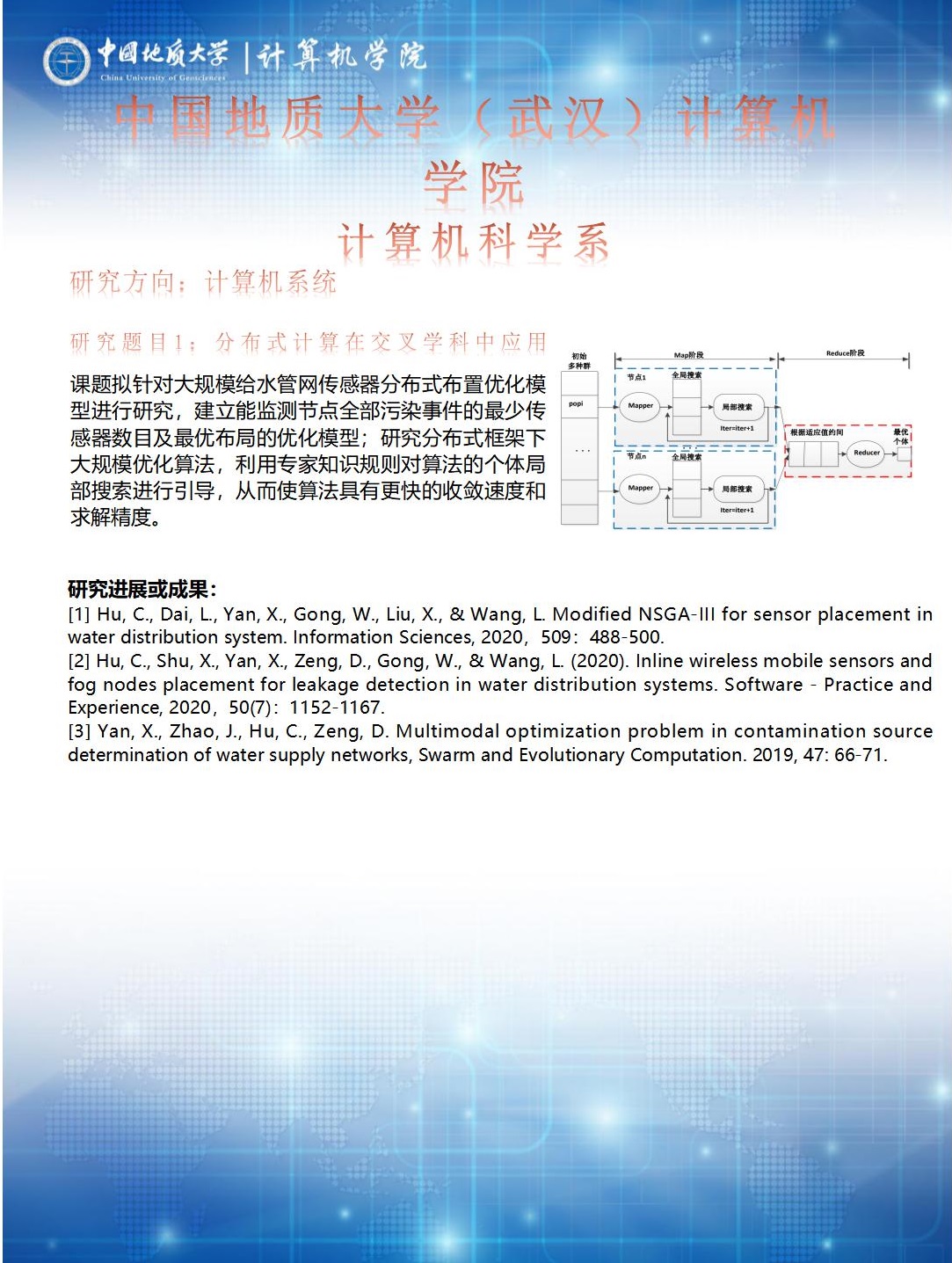 主要从事并行分布式计算、新型计算机、计算机网络与通信、嵌入式系统、信息存储、可信计算与容错计算等方面的科研工作。针对大规模给水管网传感器分布式布置优化模型进行研究,建立能监测节点全部污染事件的最少传感器数目及最优布局的优化模型;研究分布式框架下大规模优化算法,利用专家知识规则对算法的个体局部搜索进行引导,从而使算法具有更快的收敛速度和求解精度。共有专任教师9人,其中学术带头人1人,学术骨干3人;承担国家自然科学基金面上项目、国家自然科学基金青年科学基金项目、国防科工委十二五规划项目、国防基金项目、湖北省自然科学基金创新群体项目、湖北省自然科学基金面上项目、湖北省自然科学基金青年项目等20余项。在国内外专业期刊发表论文100余篇,国家发明专利和软件著作权20项。