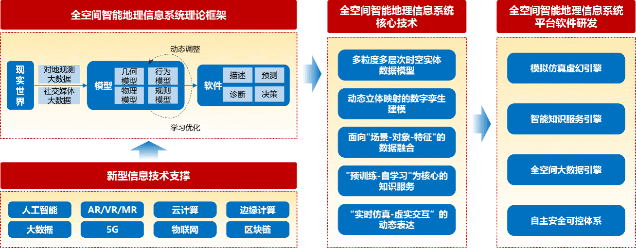面向国民经济建设和国家重大战略需求,突破地理空间信息领域“卡脖子”关键瓶颈,解决时空大数据管理、智能计算与分析等核心技术难题,研制新一代全空间智能地理信息软件系统,开展业务化重大应用和产业化推广,提升我国地理信息产业的国际竞争力。