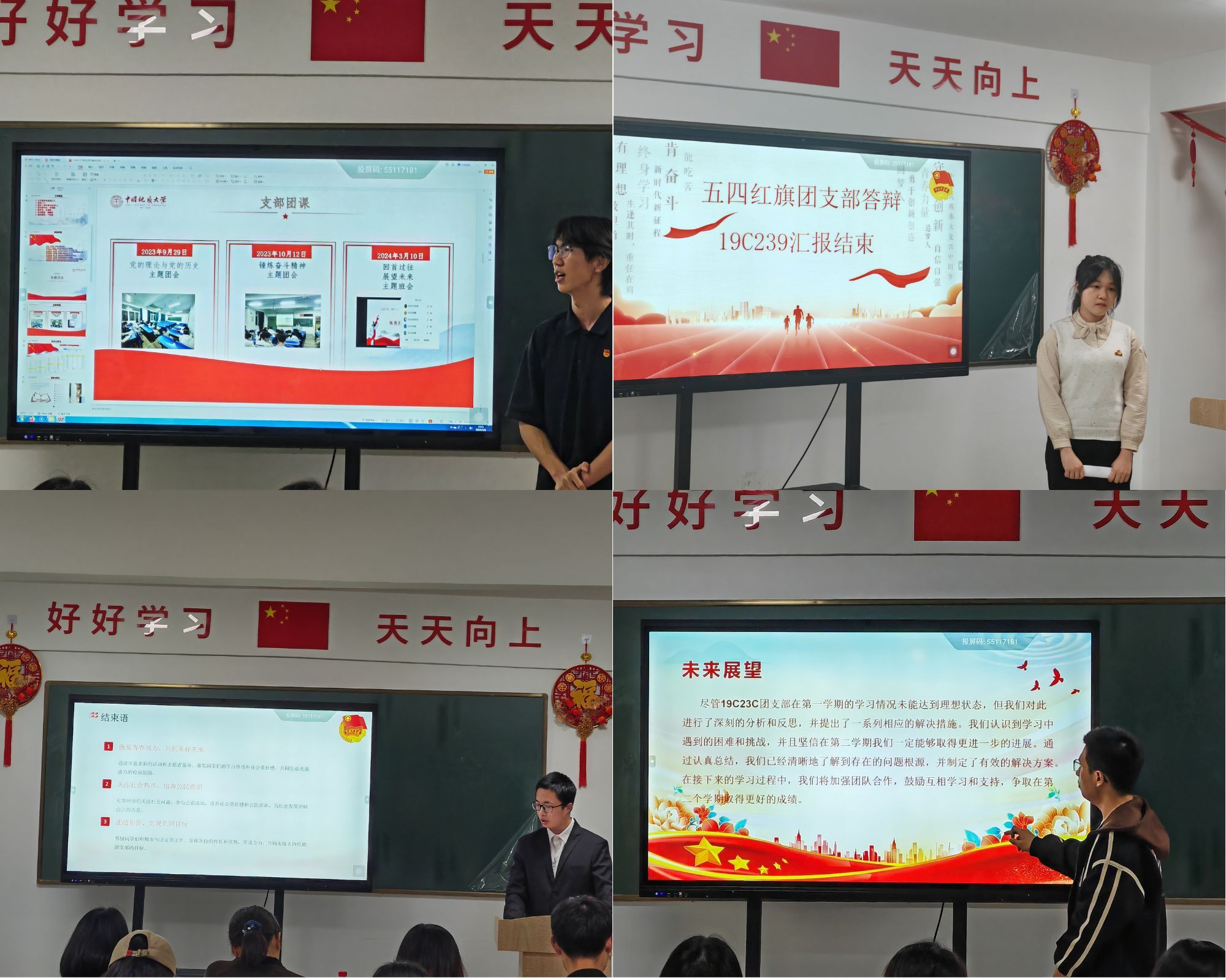 各支部结合专业特色与实际情况,从支部建设、支部活动、支部荣誉及未来展望等方面,充分展示了过去一年的工作成绩和支部风采,彰显了奋发向上、追求卓越的青春力量,呈现出一幅幅生动的团支部画卷。与此同时,现场的评委们也专心致志地对各团支部的答辩进行细心聆听并给予评议,针对各团支部的答辩情况进行提问与现场打分。