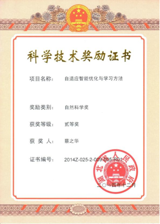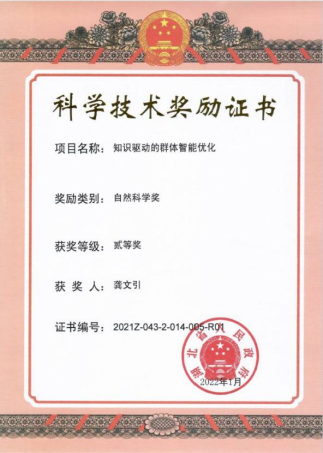 “知识驱动的群体智能优化”获得2021年度湖北省自然科学二等奖。研究相关5篇代表性论文他引516次,其中Web of Science数据库他引464次,三篇论文入选了ESI高被引论文。成果得到了19位IEEE Fellow、9位中外院士、45位SCI国际重要期刊编委等学者的正面评价,并在智能制造、物流、能源、遥感等领域得到推广应用。