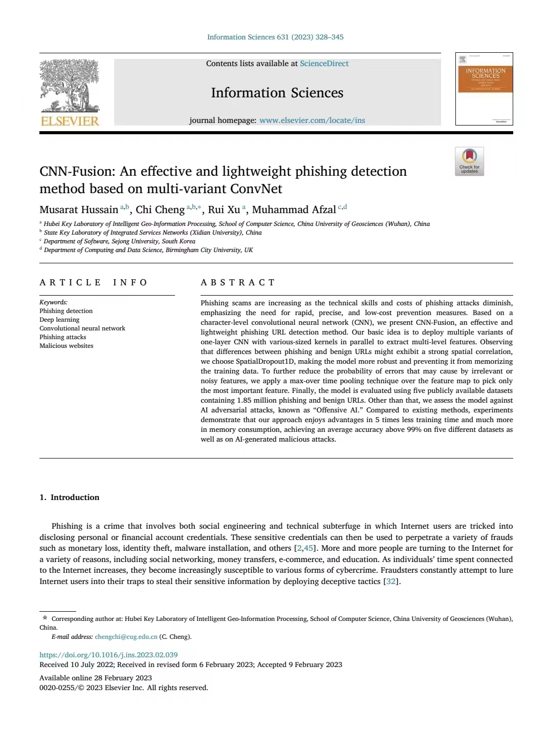 近日,我校电影天堂 程池老师团队与英国伯明翰城市大学计算Muhammad Afzal教授在国际知名期刊《Information Sciences》(T1, IF=8.233)上共同发表学术论文《CNN-Fusion: "CNN-Fusion: An Effective and Lightweight Phishing Detection Method Based on Multi-Variant ConvNet"》。论文的第一作者Musarat Hussain(中文名:胡文硕)是我校2020级巴基斯坦籍硕士研究生,通讯作者是程池老师。