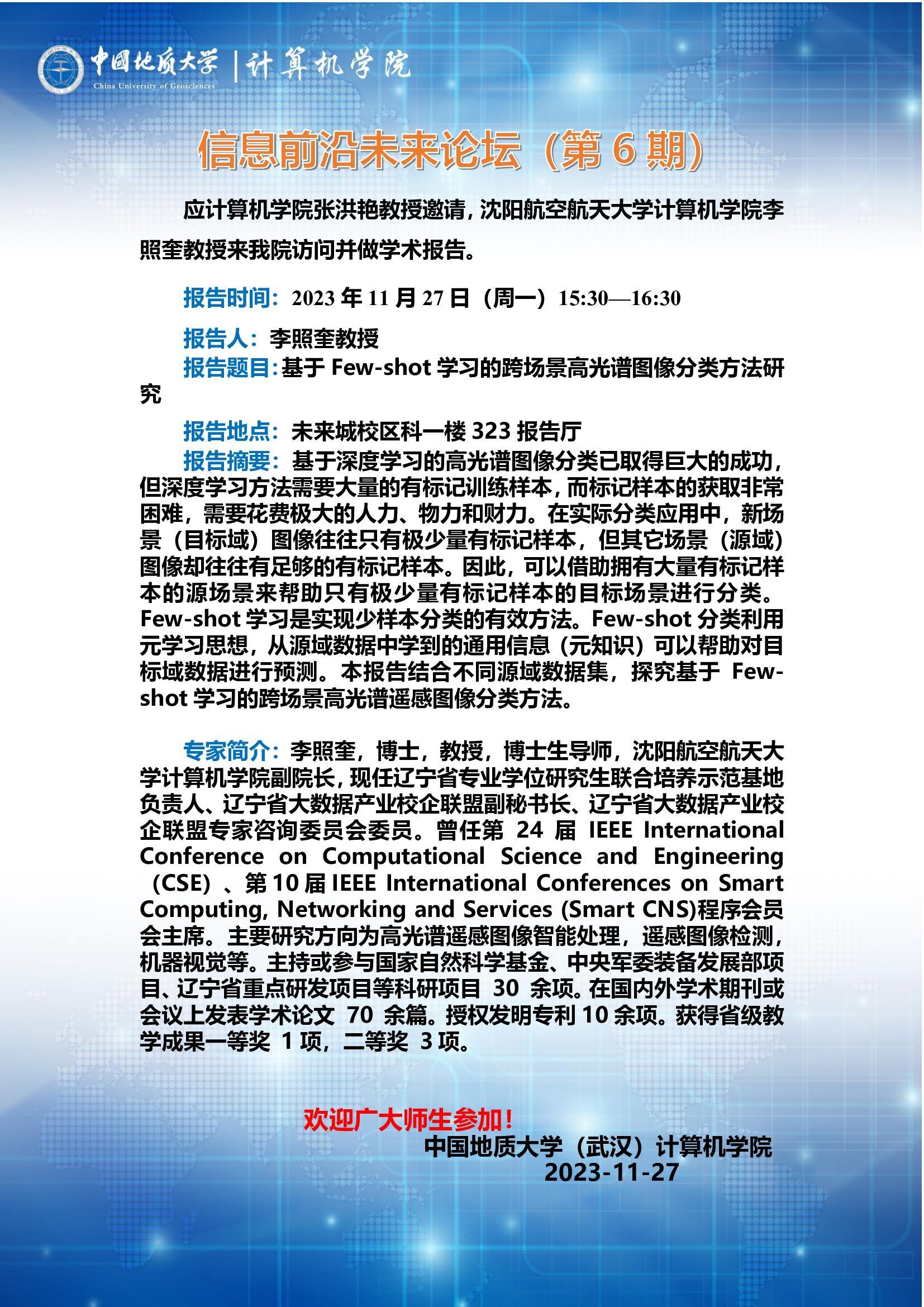 信息前沿未来论坛(第6期):沈阳航空航天大学李照奎教授——基于Few-shot学习的跨场景高光谱图像分类方法研究